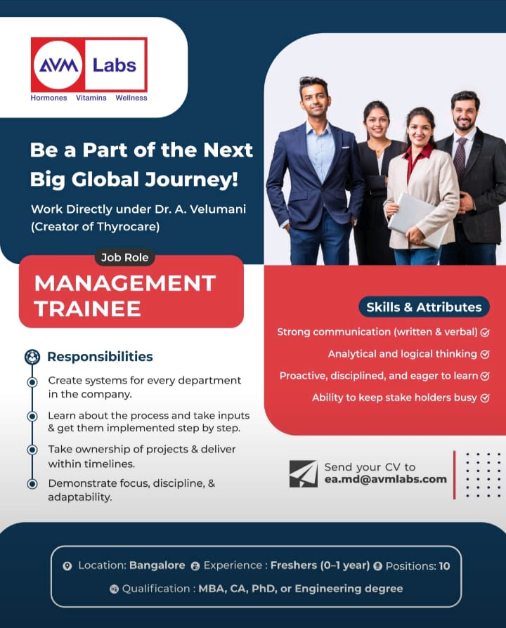 Send your resume to ea.md@avmlabs.com with subject line as Management Trainee